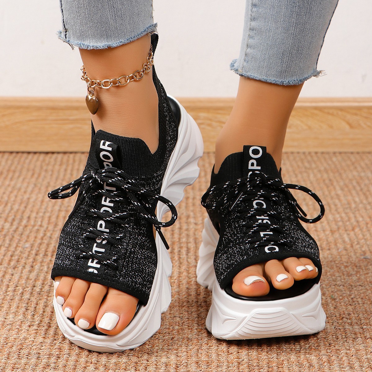 Women’s Shoes Fashion Hollowed-out Mid Heel Mesh Sports Platform Sandals